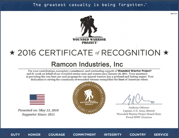 Ramcon Industries, Inc., is privileged to receive the 2016 Certificate of Recognition for our ongoing financial support for Wounded Soldier's.