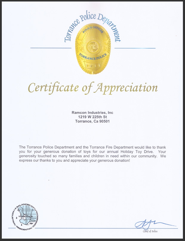 Torrance, CA- Chief of Police, John J Neu, sent Ramcon Industries, Inc a Certificate of Appreciation on behalf of the City of Torrance Police and Fire Departments for its generous donations during the holiday season. The certificate expressed how the gifts made by the company and its employees touched many families and children in need within the community.