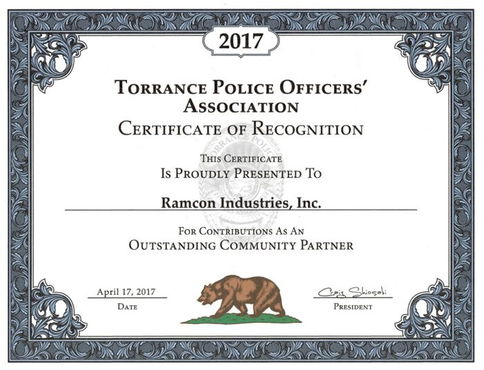 Ramcon Industries, Inc., received Certificate of Recognition from Torrance Police Officers' Association